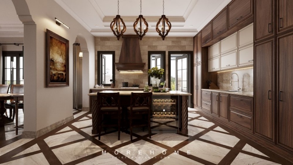 Nội thất phòng bếp từ gỗ tự nhiên mang lại sự sang trọng và tiện nghi cho nhà biệt thự cổ điển.